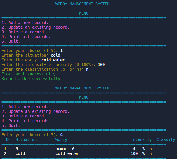 This is a Python script for a worry management database that uses SQLite as the database. The script allows the user to add, update, and delete worry records, and also sends an email notification when a new worry record with an intensity of anxiety of 100% is added. The script uses the smtplib library to send email notifications, and the termcolor library to print colored text to the console.