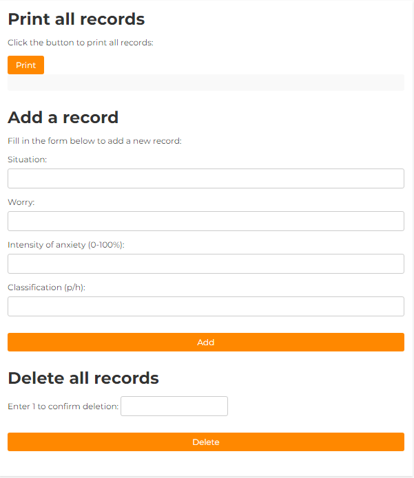 View ProjectA program that provides a worry management system. Overall, this code provides a basic system for storing and managing records. However, it is important to note that this code does not include any sort of backend storage or security measures, so the records would not persist if the page were refreshed or closed.